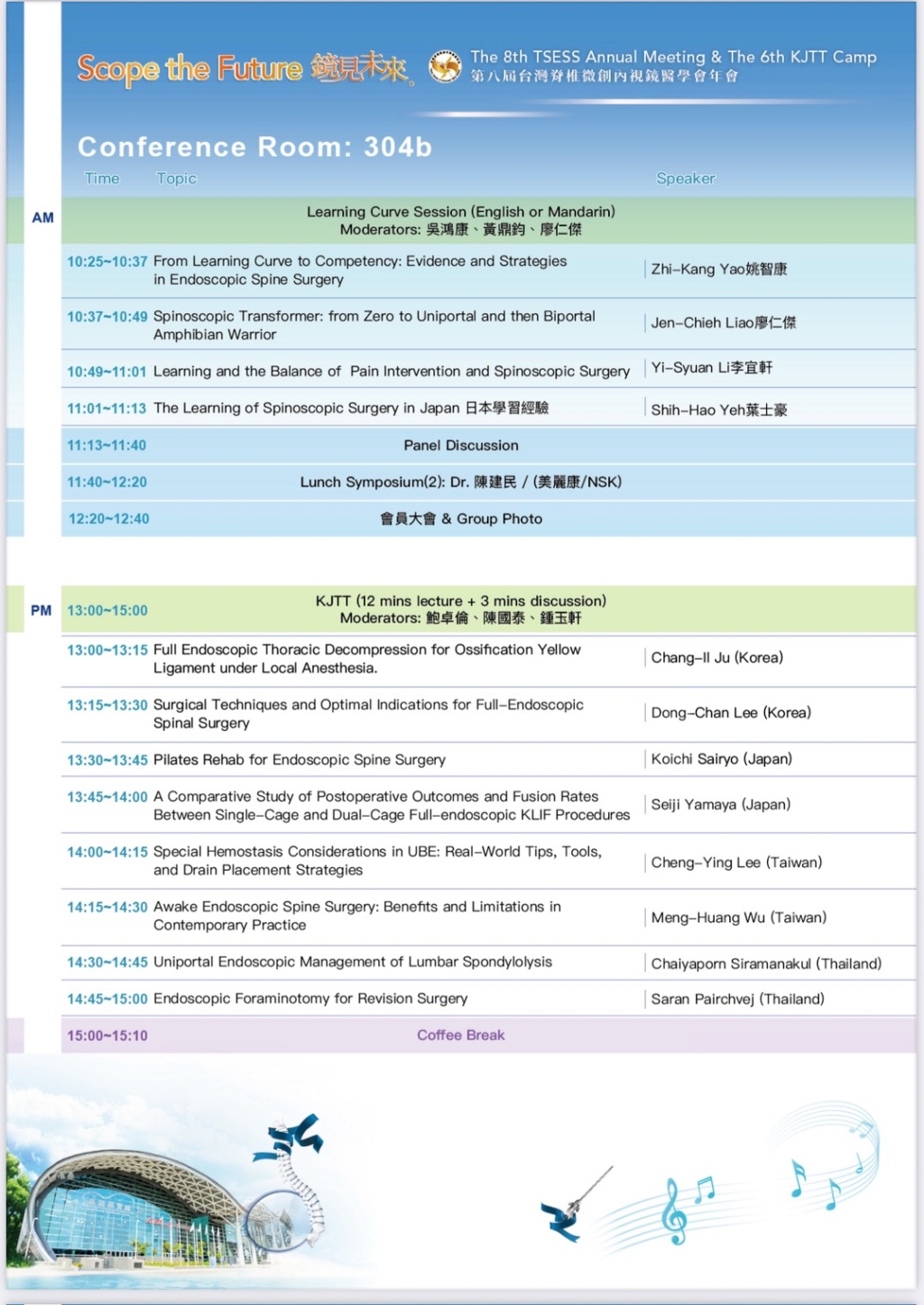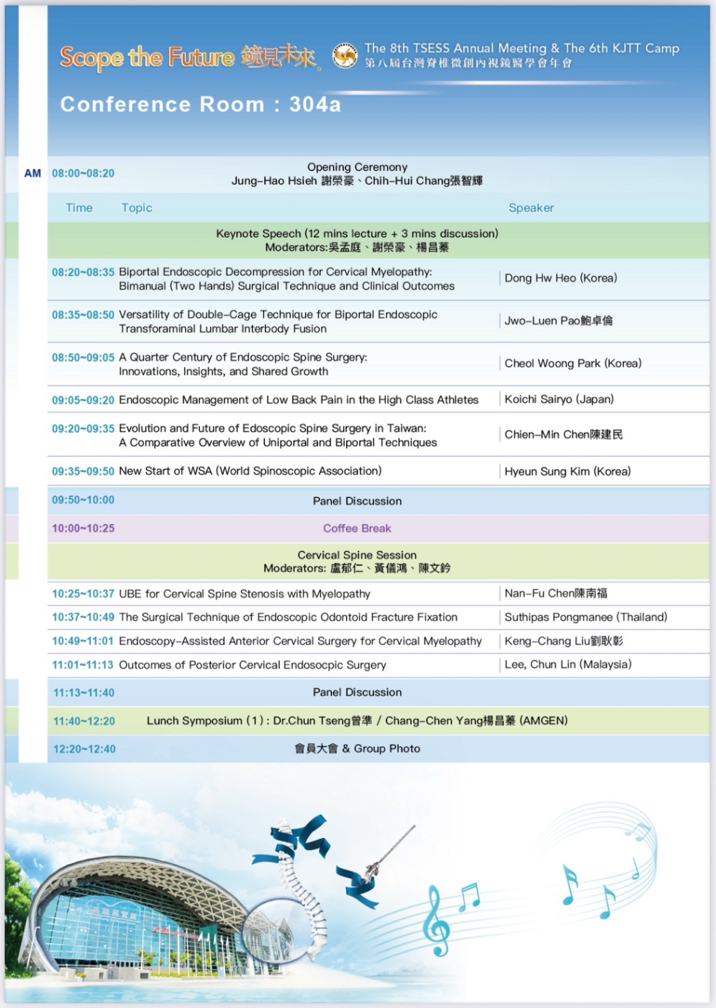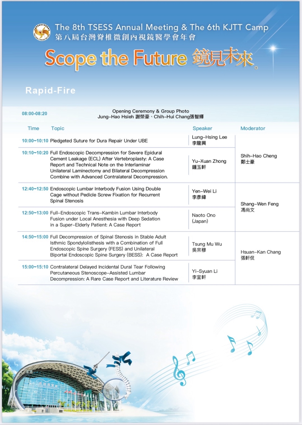 台、日、韓三國重量級講師——陳建民前理事長、鮑卓倫前理事長、Prof. Koichi Sairyo、Prof. Dong Hua Heo、Prof. Cheol Woong Park 與 Prof. Hyeun Sung Kim——將帶我們回顧脊椎內視鏡的發展與演進。最後的彩蛋「one more thing」,Prof. Kim 將發布重大消息,絕對值得大家親臨現場,共同見證歷史性的一刻!