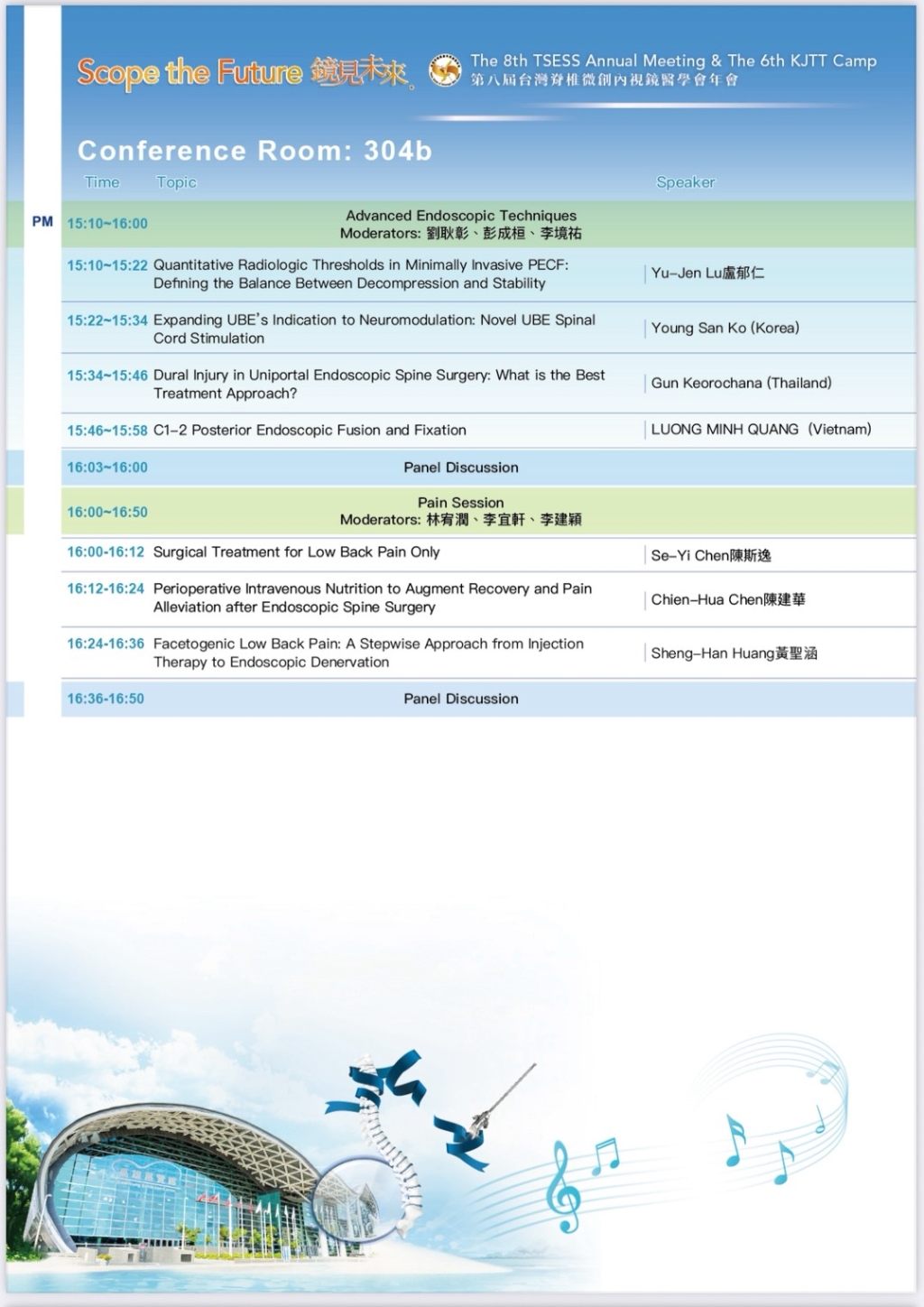 楊昌蓁部長將介紹 UBE 在 foraminal stenosis 的減壓技巧,而 Dr. Son 的胸椎 UBE decompression 亦是亮點之一,兩場內容都極具深度。