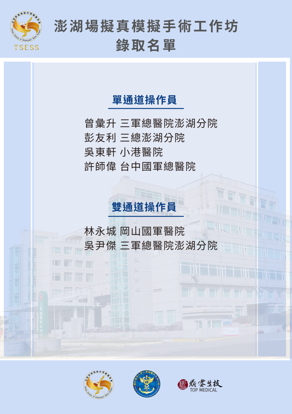 2025 台灣脊椎微創內視鏡醫學會-澎湖公益場仿真模型手術體驗工作 錄取名單!